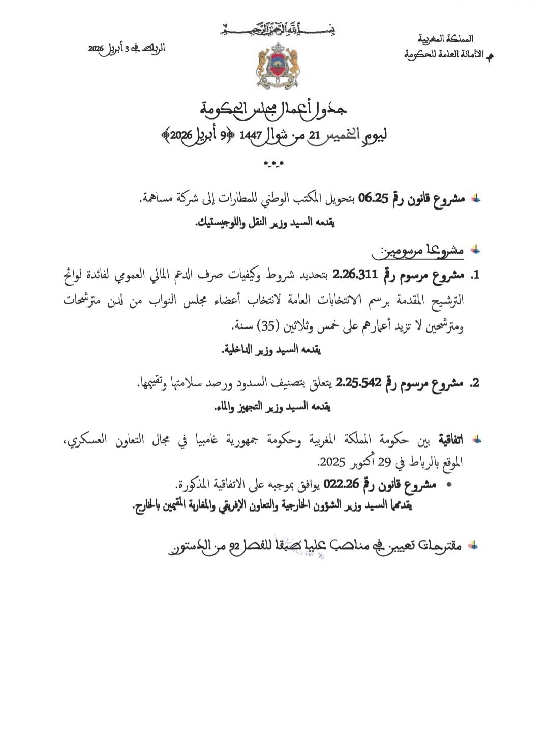 ينعقد مجلس الحكومة يوم الخميس 09 أبريل 2026، لدراسة والمصادقة على عدد من مشاريع القوانين والمراسيم ذات الطابع الاقتصادي والمؤسساتي.