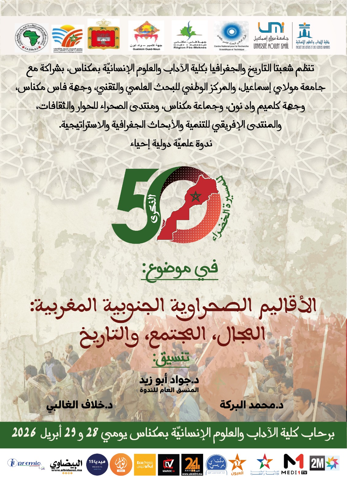 تنظم شعبة التاريخ والجغرافيا بكلية الآداب والعلوم الإنسانية بمكناس، يومي 28 و29 أبريل 2026، ندوة علمية دولية حول “الأقاليم الصحراوية الجنوبية المغربية: المجال، المجتمع، والتاريخ”، بشراكة مع عدد من المؤسسات الأكاديمية والجهوية.